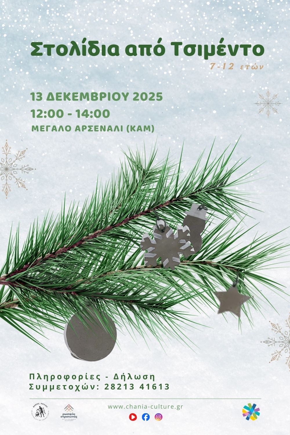 | 31186 | ΣΤΟΛΙΔΙΑ ΑΠΟ ΤΣΙΜΕΝΤΟ | https://chania-culture.gr/services/events/ergastirio/stolidia-apo-tsimento/ | Στο εργαστήριο αυτό τα παιδιά καλούνται να κατασκευάσουν μοναδικά στολίδια από τσιμέντο για το χριστουγεννιάτικο δέντρο στον ισόγειο χώρο του Μεγάλου Αρσεναλιού (ΚΑΜ) το Σάββατο 13 Δεκεμβρίου στις 12.00 το πρωί. Αρχικά θα παρασκευάσουν το μείγμα του τσιμέντου και στη συνέχεια θα το χυτεύουν μέσα σε μεταλλικά καλούπια. Μέσα από τη διαδικασία θα μάθουν για τις ιδιότητες του υλικού και θα πειραματιστούν με την υφή, το σχήμα και το χρώμα, ανακαλύπτοντας την καλλιτεχνική του διάσταση. Το αποτέλεσμα: χειροποίητα, πρωτότυπα στολίδια με γιορτινή διάθεση! Ηλικίες συμμετεχόντων: 7 – 12 ετών Δήλωση συμμετοχής: στο τηλέφωνο του Τμήματος Πολιτισμού, 28213 41613, εργάσιμες ημέρες και ώρες. Έναρξη εγγραφών: Δευτέρα 08 Δεκεμβρίου 2025. | https://chania-culture.gr/wp-content/uploads/2025/11/CONCRETE-1.jpg | 13/12/2025-13/12/2025 | Μεγάλο Αρσενάλι – Κ.Α.Μ. | Εργαστήριο | |