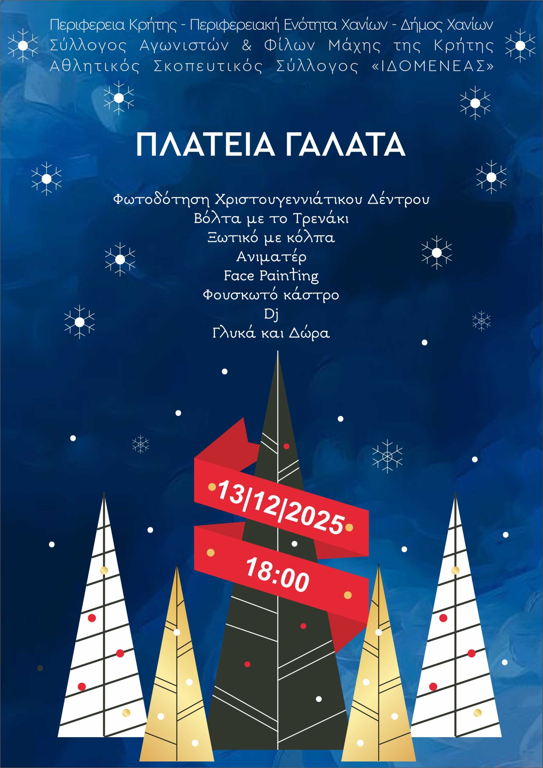 | 31194 | ΦΩΤΟΔΟΤΗΣΗ ΧΡΙΣΤΟΥΓΕΝΝΙΑΤΙΚΟΥ ΔΕΝΤΡΟΥ ΓΑΛΑΤΑ | https://chania-culture.gr/services/events/ekdiloseis/fotodotisi-christougenniatikou-dentrou-galata/ | Η Περιφέρεια Κρήτης - Περιφερειακή Ενότητα Χανίων, ο Δήμος Χανίων, ο Σύλλογος Αγωνιστών & Φίλων Μάχης της Κρήτης και ο Αθλητικός Σκοπευτικός Σύλλογος «ΙΔΟΜΕΝΕΑΣ» ανάβει το δένδρο της πλατείας στις 13/12/2025 ημέρα Σάββατο και ώρα 18.00 το απόγευμα. Το Χριστουγεννιάτικο τρενάκι θα περιμένει μικρούς και μεγάλους στην πλατεία από τις 19.00, το ξωτικό των Χριστουγέννων θα κάνει τα κόλπα του με μικρούς και μεγάλους, animater θα βάψει τα παιδιά με εορταστικά σχέδια και φουσκωτά κάστρα και μουσική από (d.j.) θα δώσουν στην πλατεία το εορταστικό κλίμα των εορτών. Γλυκίσματα και δώρα θα δοθούν σε όλα τα παιδιά. | https://chania-culture.gr/wp-content/uploads/2025/11/GALATAS_12_13_s2-scaled.jpg | 13/12/2025-13/12/2025 | Πλατεία Γαλατά | Εκδηλώσεις |