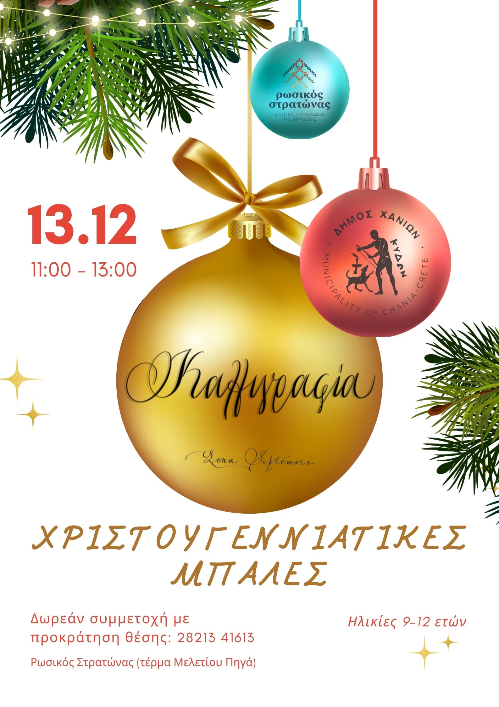 | 31191 | ΚΑΛΛΙΓΡΑΦΙΑ ΓΙΑ ΠΑΙΔΙΑ – Καλλιγραφία & Χριστουγεννιάτικες μπάλες | https://chania-culture.gr/services/events/ergastirio/kalligrafia-gia-paidia-kalligrafia-christougenniatikes-bales/ | Στο συγκεκριμένο εργαστήριο που θα γίνει το Σάββατο 13 Δεκεμβρίου 2025 στο Ρώσσικο Στρατώνα και τα παιδιά θα μάθουν καλλιγραφικά γράμματα χρησιμοποιώντας εύκολα εργαλεία γραφής. Θα πειραματιστούν με το καλλιγραφικό αλφάβητο, και θα γράψουν χριστουγεννιάτικες λέξεις και ευχές. Φεύγοντας τα παιδιά θα πάρουν όλο το υλικό του σεμιναρίου μαζί τους και δώρο μια χριστουγεννιάτικη μπάλα με το όνομά τους καλλιγραφικά γραμμένο. Το εργαστήριο θα ξεκινήσει 11:00. Υπεύθυνη εργαστηρίου: Λένα Σεπτέμβρη Το εργαστήριο απευθύνεται σε ηλικίες από 9 έως 12 χρονών . Απαραίτητη η δήλωση συμμετοχής στο τηλέφωνο του Τμήματος Πολιτισμού εργάσιμες ημέρες και ώρες 28213 41613. Οι εγγραφές θα ξεκινήσουν απο την Δευτέρα 8 Δεκεμβρίου 2025. | https://chania-culture.gr/wp-content/uploads/2025/11/Kalligrafia.jpg | 13/12/2025-13/12/2025 | Ρωσικός Στρατώνας | Εργαστήριο | |