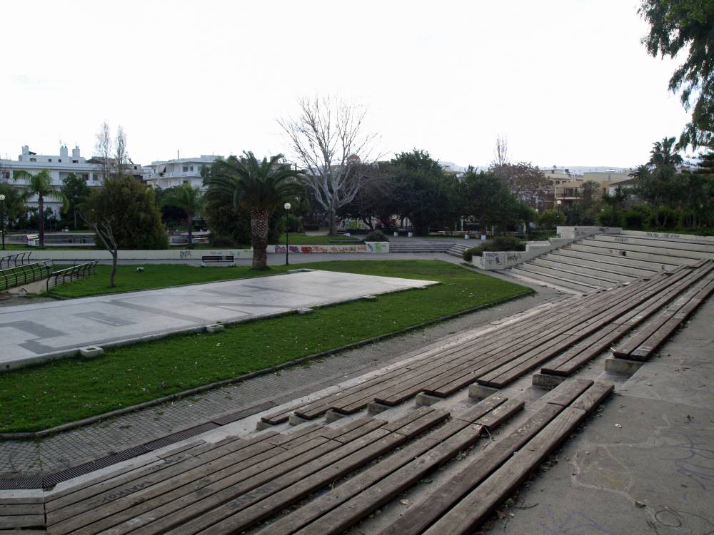 The Theatre of the Peace and Friendship Park is located in the heart of the city centre and is constantly interacting with the urban fabric. It comprises a variety of landscapes and materials, such as short plants, evergreen and deciduous trees, cobblestone paving, water, hard materials and soil. The park’s current form is the result of the study submitted to the Municipality of Chania in 1987. In recent years, efforts have been made for its upgrading in order to attract more people. The initial design of the park aimed at preserving the existing plants in most of its area and at adding more plants to it. Moreover, its four “entrances” were preserved. An open area has been created to the north, which features places to sit, trees, and an axis covered with wooden boards. This axis crosses the park until its southern entrance-exit. Walking along this axis, visitors reach the amphitheatre (located below ground level), another open area entirely covered with wooden boards and other smaller areas (also below ground level).